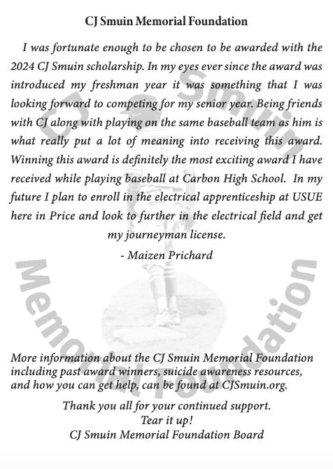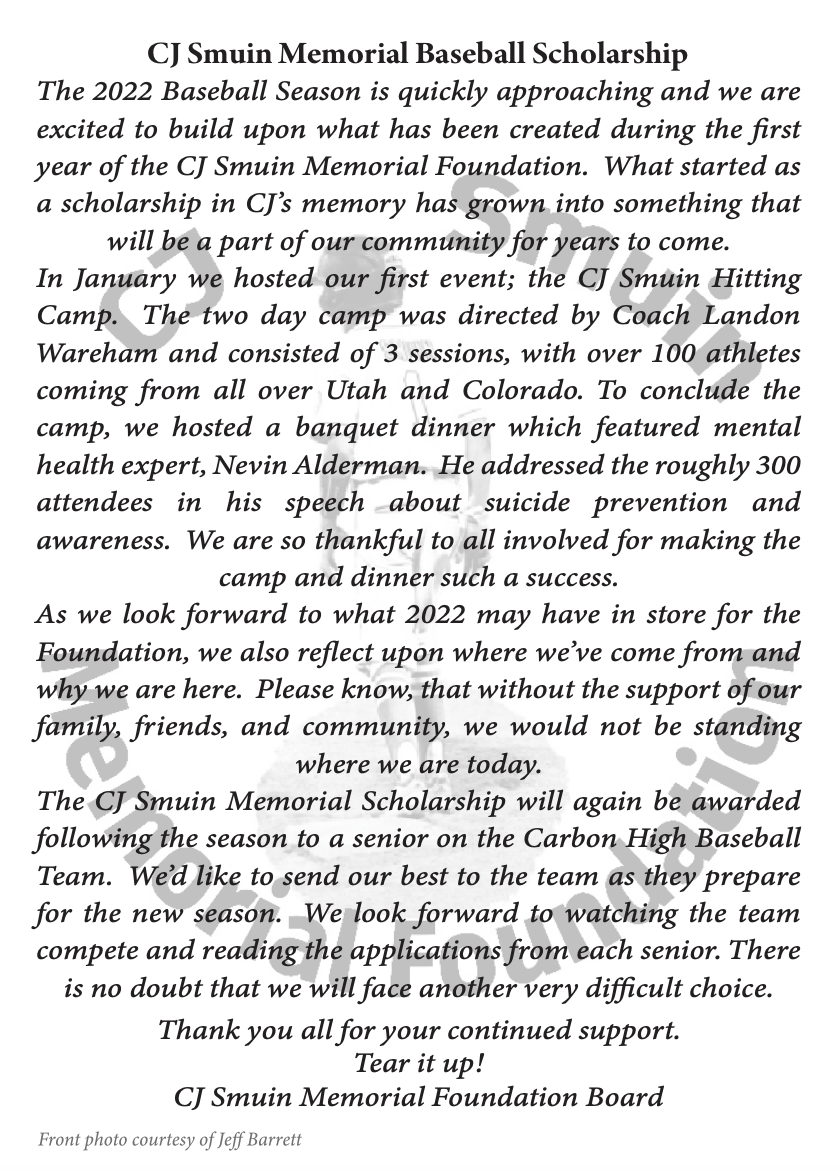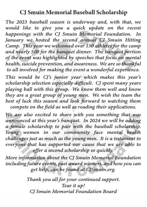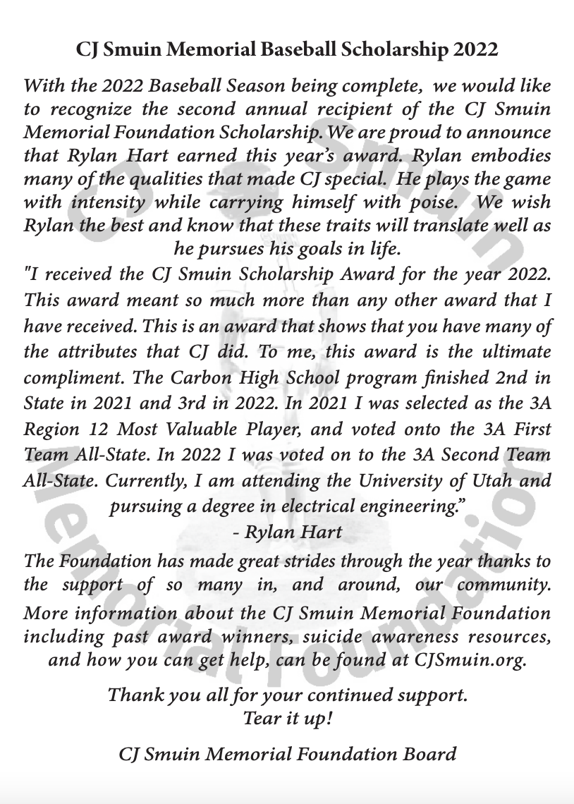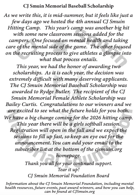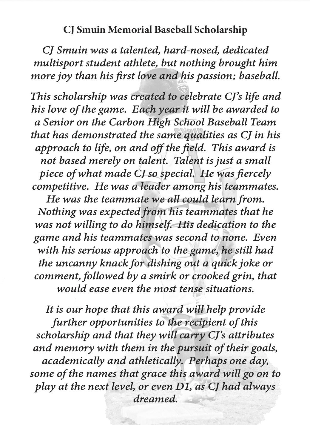 Baseball cards for the CJ Smuin Memorial Baseball Scholarship are generously donated by Peczuh Printing.